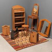 Eiken boekenkast, plantentafel, krukje, twee prullenbakken, krantenbak, twee spiegels -van één spiegel ontbreken twee decoratiestukjes - bijgevoegd-, en velours tafelkleed met blokpatroon, art deco