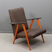 Houten cocktailstoel met gespikkelde zwarte bekleding en zwarte armleggers, circa 1960, 78 x 59 x 70 cm