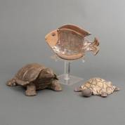 Ada Stel (1947), geglazuurd raku keramiek schildpad, gemonogrammeerd, bruingeglazuurde keramiek schildpad, en keramiek schaaltje in de vorm van een vis