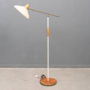 Verstelbare stalen vloerlamp met crèmekleurige krimplak kap, staand op houten basement, midden 20e eeuw -kap gedeukt-, 139 x 75 x 30 cm