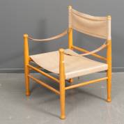 Beuken safaristoel met beige canvas bekleding en lederen armleggers, midden 20e eeuw -touw zitting niet origineel-, 78 x 58 x 52 cm