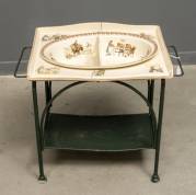 Aardewerk kinderwastafeltje op groengeschilderd metalen onderstel, de wastafel met polychroom transferdecor van huiselijke scènes in de stijl van Kate Greenaway, uitvoering Sarreguemines, Frankrijk, 1890-1900 -defecten-, 47 x 56 x 40 cm