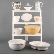 Porseleinen vijzel, aardewerk beslagkom en custardbakjes, twee schenkkannen en aardewerk terrine op onderschotel met zwart transferdecor, en porseleinen wasbak, op witgeschilderde displayetagère
