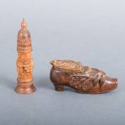 Houten naaldenkoker met wijnrankendecor in reliëf, Duitsland -kleine defecten-, en houten snuifdoos in de vorm van een schoen, beide 19e eeuw