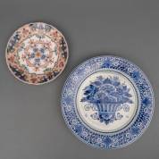 Delfts aardewerk schotel met blauw-wit bloemenmanddecor, uitvoering De Porceleyne Fles, 20e eeuw, daarbij: aardewerk bord met polychroom bloemdecor, uitvoering Koninklijke Tichelaar, Makkum, 20e eeuw