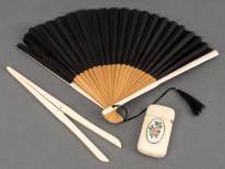 Ivoren tondeldoosje met emaille plaquette en ivoren handschoenenspanner, beide eerste kwart 20e eeuw, daarbij: benen waaier, 18 cm