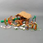 Kerststalgroep bestaande uit: polychroom beschilderde gipsen beeldjes en houten stal -gebruikssporen en defecten-