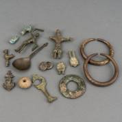 Diverse bodemvondsten: bronzen amuletten, bronzen lepel, circa 1500, kledingornament, spinsteentje, etc., Ø 8,5 cm