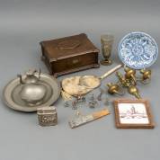 Divers kleingoed, waaronder tin, mangaankleurig tegeltje, beschilderd glas en messing wandkandelaber