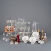 Zes porseleinen soepkommen met platina rand, op schotels, glazen karaf en drinkglazen met geslepen decor, diverse kandelaars, vaasjes, etc.