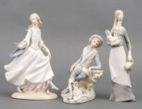 Drie polychroom beschilderde porseleinen beeldjes: Assepoester, en jongen met hond, Lladró -defecten-, en boerin met kip, Carl Scheidig, 27 cm