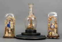 Papieren beeldgroep in kristallen karaf: kruisiging, op gezwart houten basement, daarbij: twee altaarstukken onder stolpen: heiligen, diverse materialen -defecten-