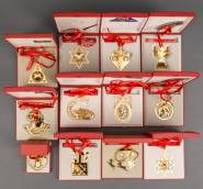 Twaalf vergulde messing kerstdecoraties, jaaruitgaven 1984 tot en met 1995, uitvoering Georg Jensen, Denemarken, alle in originele verpakkingsdozen, 10 cm