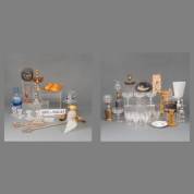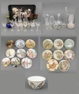Dienblaadje met divers geslepen glas en kristal, waaronder: karaffen, glaasjes, en dekseldoosjes -gebruikssporen-, daarbij: 18 porseleinen sierbordjes en één grote kom met polychroom decor