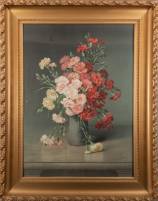 Litho in lijst: bloemstilleven met trosanjers, monogram A.N. -enkele defecten-, 79 x 57 cm
