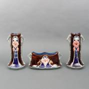 Driedelig porseleinen kaststel met blauw-bruin glazuur en floraal decor, art nouveau-stijl, 30 x 16 x 16 cm
