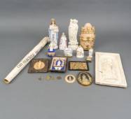 Diverse religieuze objecten, waaronder: porseleinen beeldjes, medaillons, gipsen plaquette, polychroom beschilderd houtsnijwerk en perkamenten bijbelpagina
