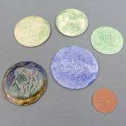 Inka Klinckhard (1922-2016), vijf ronde keramische penningen, waarvan enkele met christelijke voorstelling, en waarvan drie gesigneerd, daarbij: één andere keramische penning met vogeldecor, Ø 13 cm