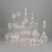 Divers geslepen kristal, glazen karaffen, en wijnglazen -gebruikssporen-