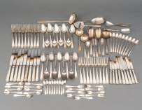 Negenpersoons verzilverde bestekcassette, Haags lof, Sola, bestaande uit: grote couverts, grote messen, dessertcouverts, dessertmessen, soepdienlepel, aardappellepel, paar sauslepels, paar groentelepels, slacouvert, kaasschaaf, longdrinklepels, taartvorken, theelepels, mokkalepeltjes, paar vleesvorkjes, jamlepel, en botermesje, daarbij: verzilverde rijstlepel, Haags lof, Gero