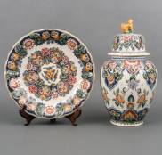 Aardewerk wandbord en balustervormige dekselvaas met polychroom floraal decor, uitvoering Koninklijke Tichelaar, Makkum, Ø 36,5 cm