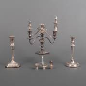Verzilverde drielichts kandelaar op hoge voet, à double usage, verzilverde drielichts kandelaar op vierkante voet, à double usage, en verzilverde kandelaar op rechthoekige geribbelde voet, alle Gero