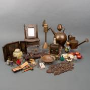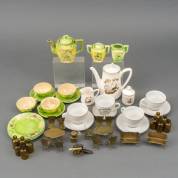 Wit porseleinen kinderserviesgedeelte met decor van kinderen, groen aardewerk kinderserviesgedeelte met bloesemdecor -gebruikssporen-, messing miniatuurmeubels, etc.