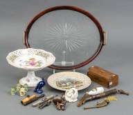 Porseleinen tazza met polychroom strooibloemdecor, Dresden, porseleinen bord met polychroom transferdecor, en geslepen glazen dienblad met divers kleingoed, waaronder: kistje, hoornen pijp, en fluitjes