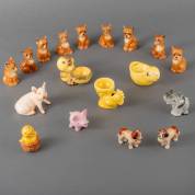 Porseleinen beeldjes: negen boxers, drie eierdoppen, zoutstrooier, twee sint-bernardshonden, olifant en twee varkens, uitvoering Goebel, Duitsland