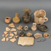 Divers archeologisch aardewerk en fragmenten daarvan, waaronder een gladwandige kruik en aardewerk met zwart slibdecor -defecten-