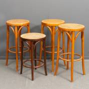 Drie gebogen houten krukken met rietbespanning, en één donkerbuingebeitste soortgelijke kruk, alle Thonet-stijl, tweede helft 20e eeuw, 75 x Ø 36 cm