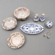 Djokja zilveren vingerkom en zes Djokja glasonderzetters, daarbij: Delfts aardewerk ménagère bestaande uit: peper en zoutstrooier met onedele monturen, mosterdpotje met twee onedele lepeltjes, en dienblaadje, 18 x 8 cm