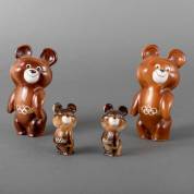 Twee grote en twee kleine porseleinen beren met Olympische ringen op hun ceintuur: mascotte van de Olympische zomerspelen 1980 in Moskou