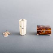 Klein schildpad dekseldoosje, ivoren reisnécessaire met inhoud -één onderdeel manco, krimpscheuren-, en parelmoer kruishanger, gegraveerd 'Bethlehem', alle 19e eeuw