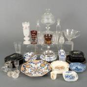 Divers geslepen glas, blikjes met parelmoer inlegwerk, Delfts blauw aardewerk, etc.