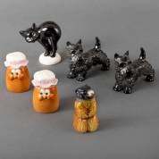 Porseleinen beeldjes: twee Schotse terriërs, zwarte kat -staart ontbreekt-, marmot, en twee strooiers in de vorm van kokkinnen, uitvoering Goebel, Duitsland