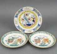 Twee aardewerk borden met polychroom decor: '1619 Mei 1919 VOC' boven retourschip en stadswapens, De Porceleyne Fles, Delft, daarbij: aardewerk bord met polychroom bloemdecor, 19e eeuw, Delft -gelijmd-, Ø 26 cm