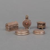 Vier metalen dekseldoosjes, en metalen hennahouder aan kettinkje