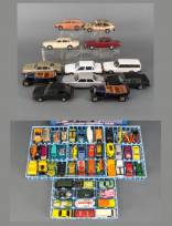 Twaalf kunststof Volvo-schaalmodellen, uitvoering Stahlberg, Finland, schaal circa 1:20, daarbij: koffertje met diverse speelgoedautootjes, diverse merken