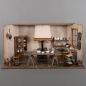 Beschilderde houten poppenkeuken, met personeelslid, en porseleinen, metalen en houten inboedel, 40 x 76 x 30 cm