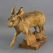 Geprepareerde haas, op boomstronk -deel vacht op poot manco-, 46 x 70 x 40 cm