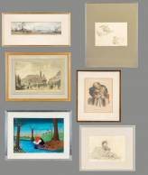 Zes wanddecoraties, waaronder: poezen, studietekening in pen, -lichte waterschade-, 'Het stadhuis te Haarlem', gravure, en Engelse jachtscène, aquarel op papier -defecten-