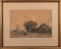 Théophile de Bock (1851-1904), figuren op een landweg langs een boerderij, pasteltekening, gesigneerd -waterschade aan de linkerzijde-, 29 x 43 cm