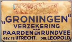 Emaille reclamebord: ''Groningen' verzekering van paarden en rundvee, gev. te Utrecht. dir. Leopold' -randschade-, 39 x 65 cm