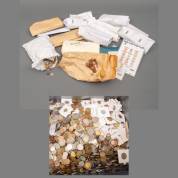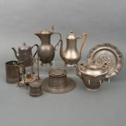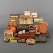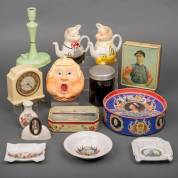 Drie gelithografeerde bewaarblikken, twee aardewerk theepotten in de vorm van varkens, drie porseleinen herinneringsbakjes en -vaasje, celluloid lampvoet, tafelklok, adres: Smith, Engeland, etc.