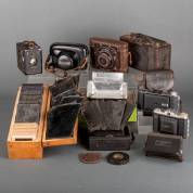Diverse oude camera's, waaronder Konica, en toebehoren, waaronder glasnegatieven