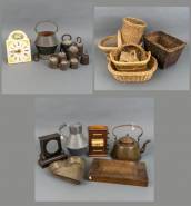 Diverse rieten manden, klokje -incompleet-, gewichten, koperen ketel, etc.