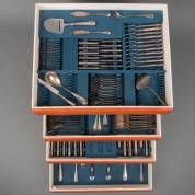 Verzilverde bestekcassette, Hollands glad, uitvoering Keltum, bestaande uit: twaalf grote messen, twaalf kleine messen, twaalf grote couverts, twaalf kleine couverts, twaalf viscouverts, visdienschep, elf fruitmessen, twaalf fruitvorken, twaalf dessertlepeltjes, twaalf mokkalepeltjes, slacouvert, taartschep, aardappellepel, twee groentelepels, vlalepel, twee sauslepels, twee vleesvorkjes, vleesvork, krokettenschepje, kaasmesje, dienlepel, twee botermesjes, jamlepel en kaasschaaf