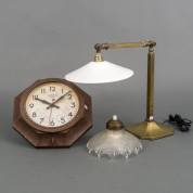 Messing bureaulampje met opaline kapje, glazen lampenkapje, en elektrische wandklok in bakelieten kast, 38 cm