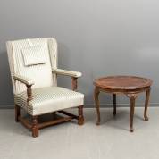 Eiken oorfauteuil bekleed met wit-groen gestreepte stof, 20e eeuw, daarbij: rond bruingebeitst tafeltje, de poten met gesneden volutendecor, 105 x 72 x 82 cm